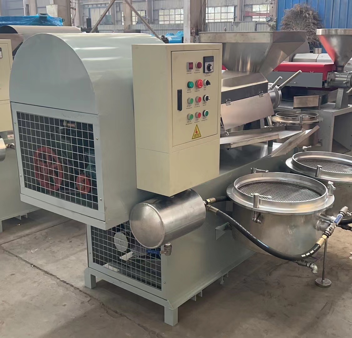 7.新榨油機安裝后進行4—8小時磨榨,方法是用已榨干油的餅料從料斗中緩緩喂入,反復回榨,使榨膛磨光,切記開始磨榨不要將料直接倒入料斗內,而以手抓喂入為宜,以防榨螺軸卡死。如喂料過猛,榨膛內出現(xiàn)異常響聲或榨螺軸卡死,應立即停車,消除梗阻,或重新裝配好后再啟動磨榨,嚴禁強行拖車。8.正常榨油時,必須保持進料均勻,切勿過多過少或斷料空轉。此時機器負荷正常,運轉平穩(wěn),響聲有節(jié)奏。出餅順暢,低壓段基本無渣,高壓段有少量油渣,但渣在油中的比例不大于10%,榨膛內溫度可達150—200℃,出餅口出冒出青煙應通過護罩由抽煙管排出。榨出熱餅要及時攤開,不要急于打堆或裝運,否則會產生自然現(xiàn)象。當連續(xù)工作時間較長,機溫過高時,應采取電扇吹風等降溫措施。
